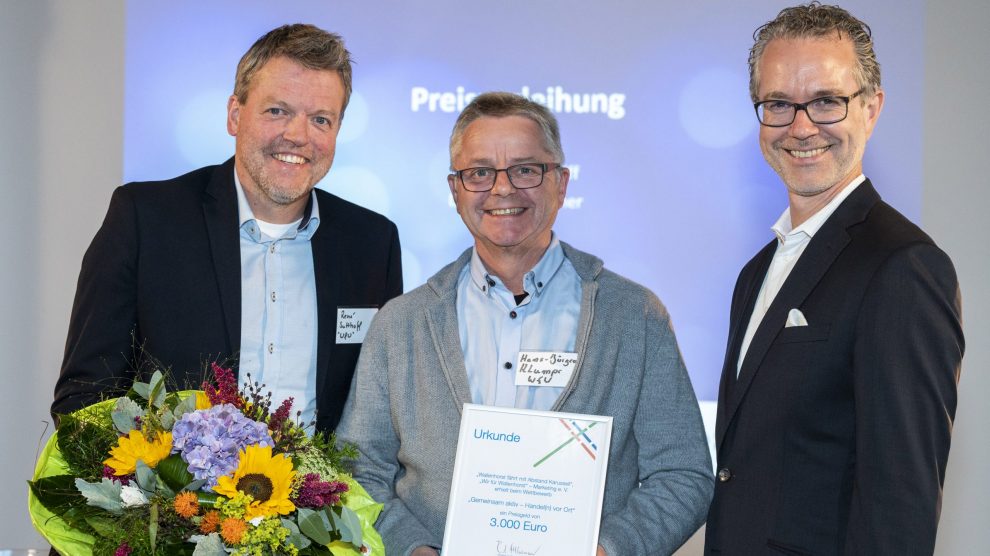 Im vergangenen Jahr konnte der Marketingverein unter anderem mit dem Weihnachtsmarkt ein Zeichen setzen, was mit Flexibilität und Zusammenhalt möglich ist. Durch den Wechsel auf das komplett umzäunte Gelände an der Hollager Mühle inklusive einem umfassenden Hygienekonzept und der Unterstützung der Messdiener Hollage bei den erforderlichen Kontrollen, konnte der Weihnachtsmarkt als einer der wenigen in der Region stattfinden und wird es dieses Jahr am ersten Adventswochenende wieder. Weiteres Highlight war die Aktion „Wallenhorst fährt mit Abstand Karussell“ inklusive verkaufsoffenem Sonntag in mitten der Pandemie. Eine Idee, für die der Marketingverein am Abend vor der Mitgliederversammlung ausgezeichnet worden ist. Unter dem Motto „Handel 2022 – Aufbruch in die Zukunft“ hatten Niedersächsisches Wirtschaftsministerium, IHK Niedersachsen (IHKN), Genossenschaftsverband Weser-Ems, Handelsverband Niedersachsen-Bremen e.V. (HNB) und Nordenham Marketing und Touristik e.V. zum landesweiten Wettbewerb aufgerufen. „Wallenhorst fährt mit Abstand Karussell“ wurde als eine der zwölf besten Ideen ausgezeichnet. Hans-Jürgen Klumpe und Rene Sutthoff nahmen den Preis für die gemeinschaftliche Stärkung des Einzelhandels in Lüneburg in Empfang und brachten Urkunde und 3.000 Euro Preisgeld Euro direkt mit zur Mitgliederversammlung.