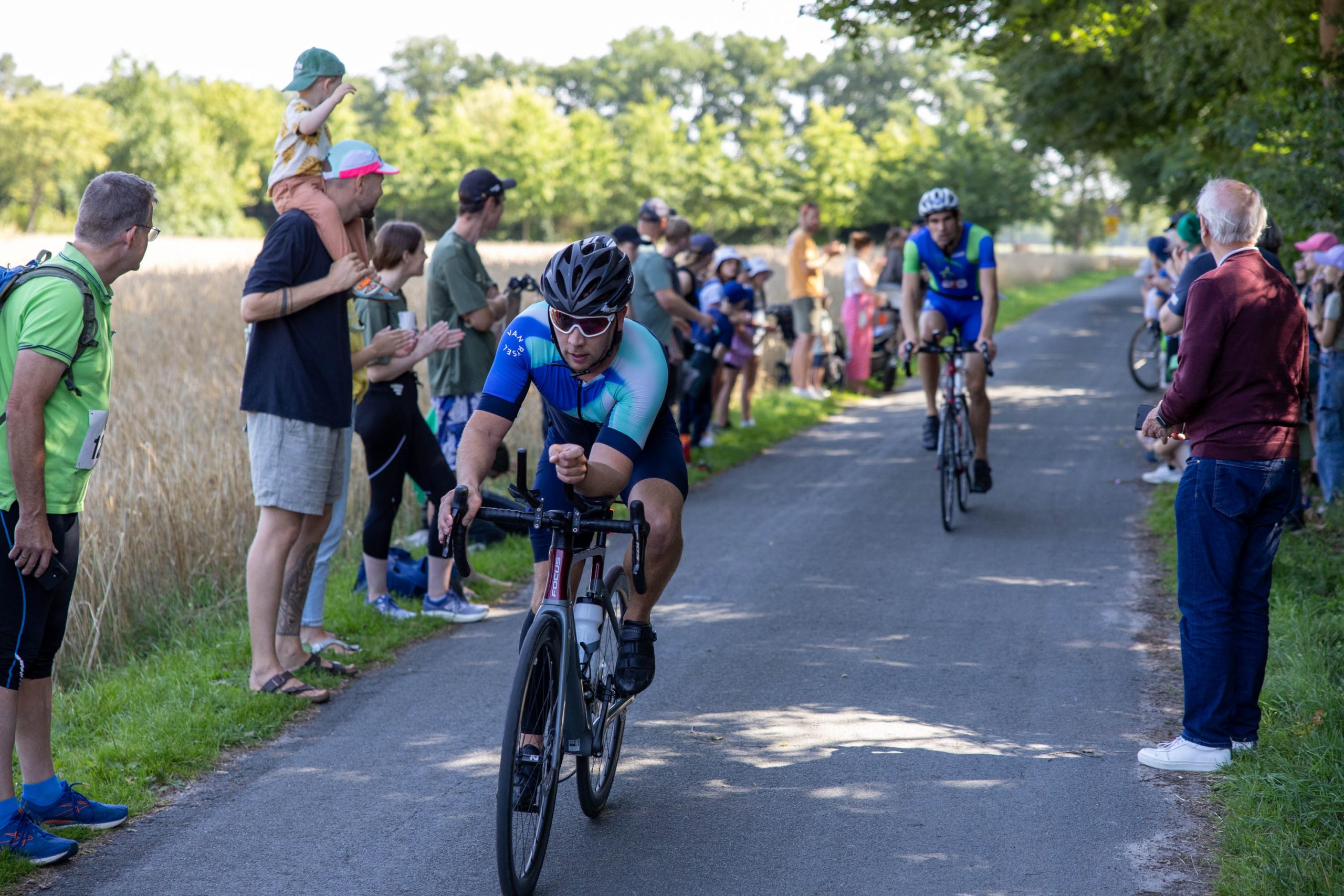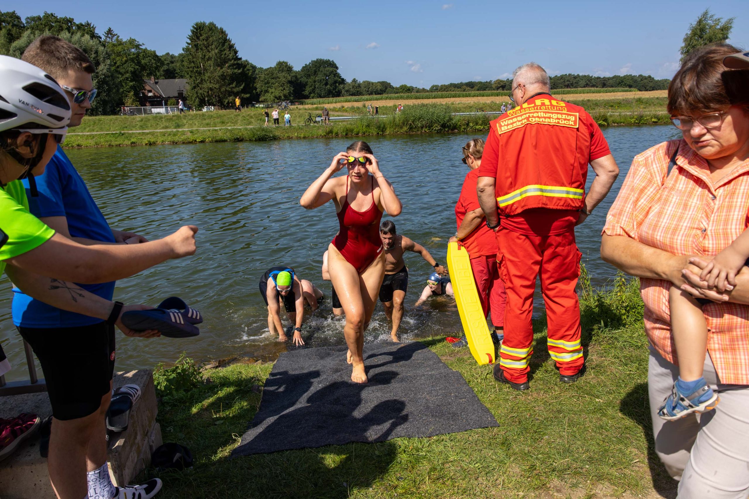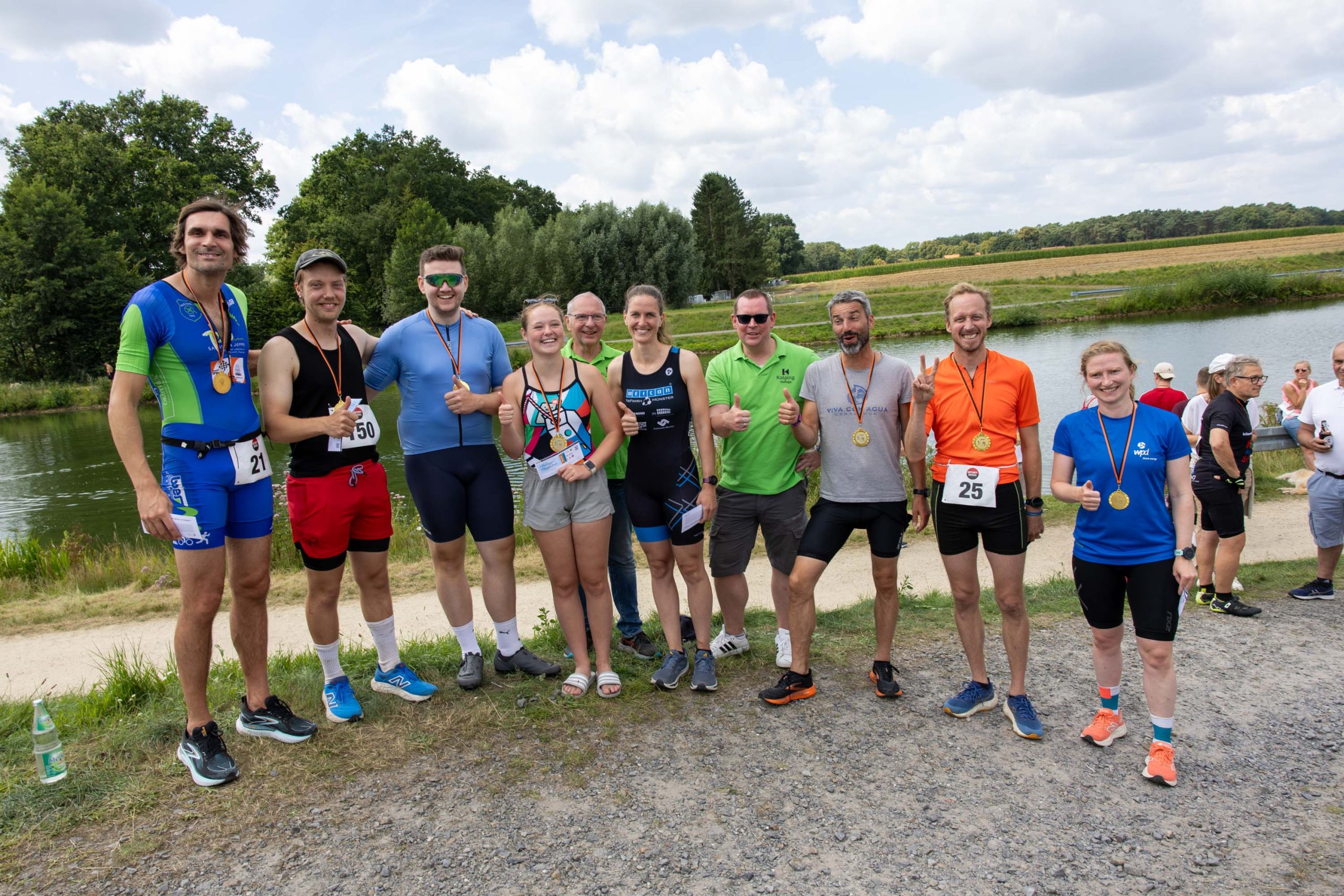 Grund zur Freude gab es aber nicht nur bei den Organisatoren. Auch die Sportlerinnen und Sportler waren bester Laune. Sie absolvierten die Disziplinen – 500 Meter Schwimmen, 20 Kilometer Radfahren und 5 Kilometer Laufen – angefeuert von zahlreichen Zuschauerinnen und Zuschauern im Start-Ziel-Bereich am Kolping-Rastplatz am Mühlenbach-Düker einzeln, im Team oder in der Staffel in Zeiten zwischen 1:05:33 und gut zwei Stunden. Den fairen Wettkampf, bei dem der Spaß und der gute Zweck im Vordergrund standen, konnten Markus Keeve mit hauchdünnem Vorsprung vor Folkert Schultz und Marcus Demmler, Jana Bramme knapp vor Henrike Müller sowie die Staffel der DPSG Ostbevern mit Mira Jörden, Robin Hübner und Lennert Delorme für sich entscheiden. Neben einer Medaille, die alle Teilnehmenden erhielten, überreichte Alexander Kühl ihnen seitens der Kolpingsfamilie Hollage auch Eintrittskarten für das Hollager Oktoberfest.