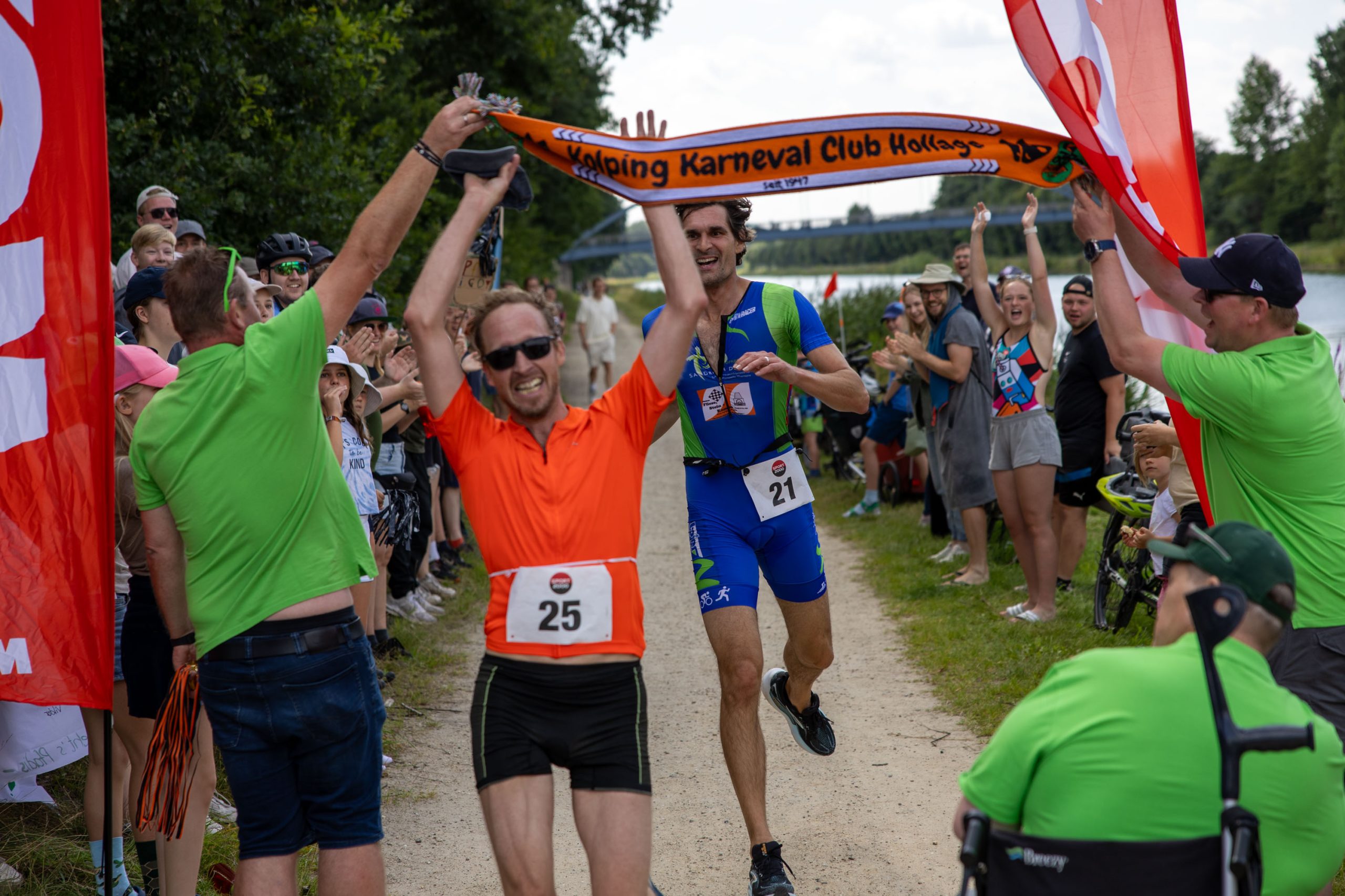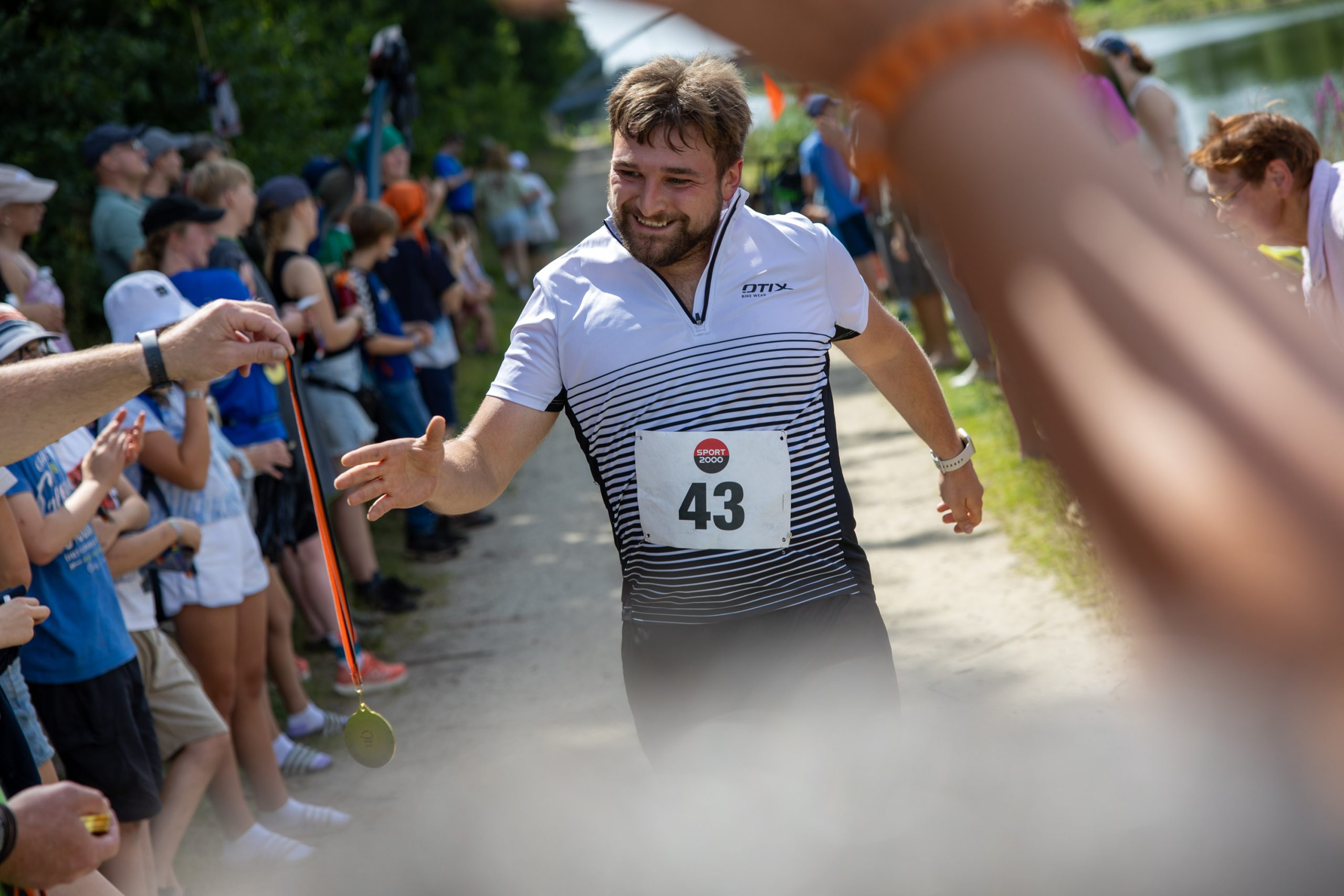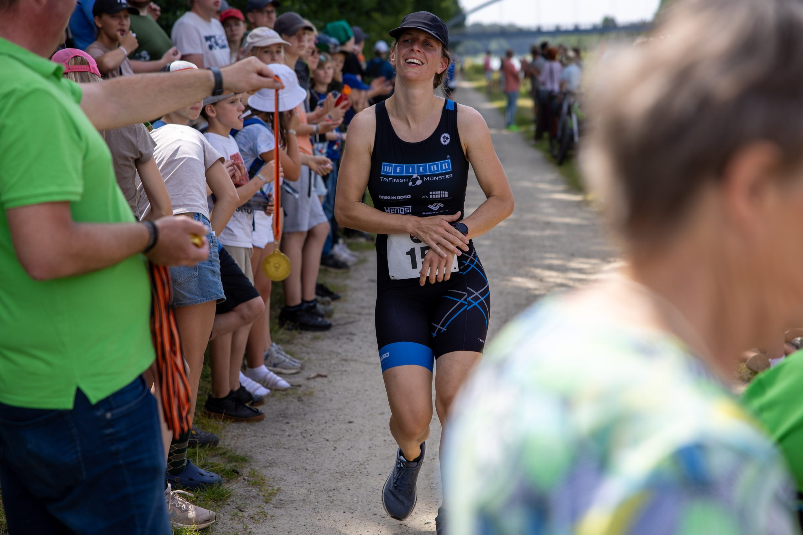 Grund zur Freude gab es aber nicht nur bei den Organisatoren. Auch die Sportlerinnen und Sportler waren bester Laune. Sie absolvierten die Disziplinen – 500 Meter Schwimmen, 20 Kilometer Radfahren und 5 Kilometer Laufen – angefeuert von zahlreichen Zuschauerinnen und Zuschauern im Start-Ziel-Bereich am Kolping-Rastplatz am Mühlenbach-Düker einzeln, im Team oder in der Staffel in Zeiten zwischen 1:05:33 und gut zwei Stunden. Den fairen Wettkampf, bei dem der Spaß und der gute Zweck im Vordergrund standen, konnten Markus Keeve mit hauchdünnem Vorsprung vor Folkert Schultz und Marcus Demmler, Jana Bramme knapp vor Henrike Müller sowie die Staffel der DPSG Ostbevern mit Mira Jörden, Robin Hübner und Lennert Delorme für sich entscheiden. Neben einer Medaille, die alle Teilnehmenden erhielten, überreichte Alexander Kühl ihnen seitens der Kolpingsfamilie Hollage auch Eintrittskarten für das Hollager Oktoberfest.