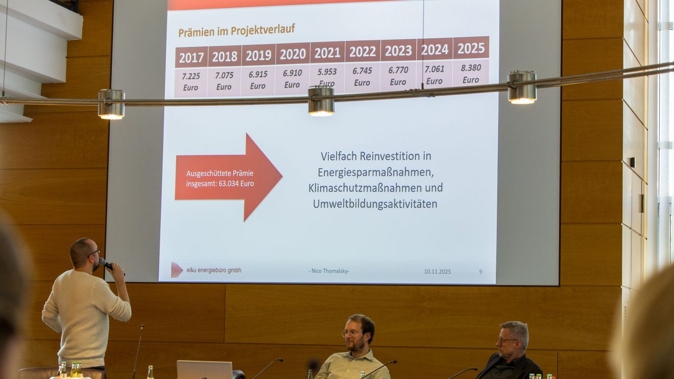 Zuvor hatte Nico Thomalsky vom e&u energiebüro aus Bielefeld, der das Projekt pädagogisch begleitet, eine Bilanz seit Beginn des Projektes im Jahr 2016 gezogen. In dieser Zeit wurden insgesamt 1,2 Millionen kWh an Wärme und 120.333 kWh an Strom eingespart. Eine beachtliche Zahl, die umgerechnet zu einer Einsparung von circa 400 Tonnen CO2 führt. „Verbildlicht bedeutet diese Menge ungefähr den Ausstoß an CO2, der entsteht, wenn man 33 Mal mit dem Auto um die Erde fährt. Oder man könnte dafür 3,8 Millionen Tassen Kaffee trinken“, machte Thomalsky den Erfolg nochmal sichtbarer.