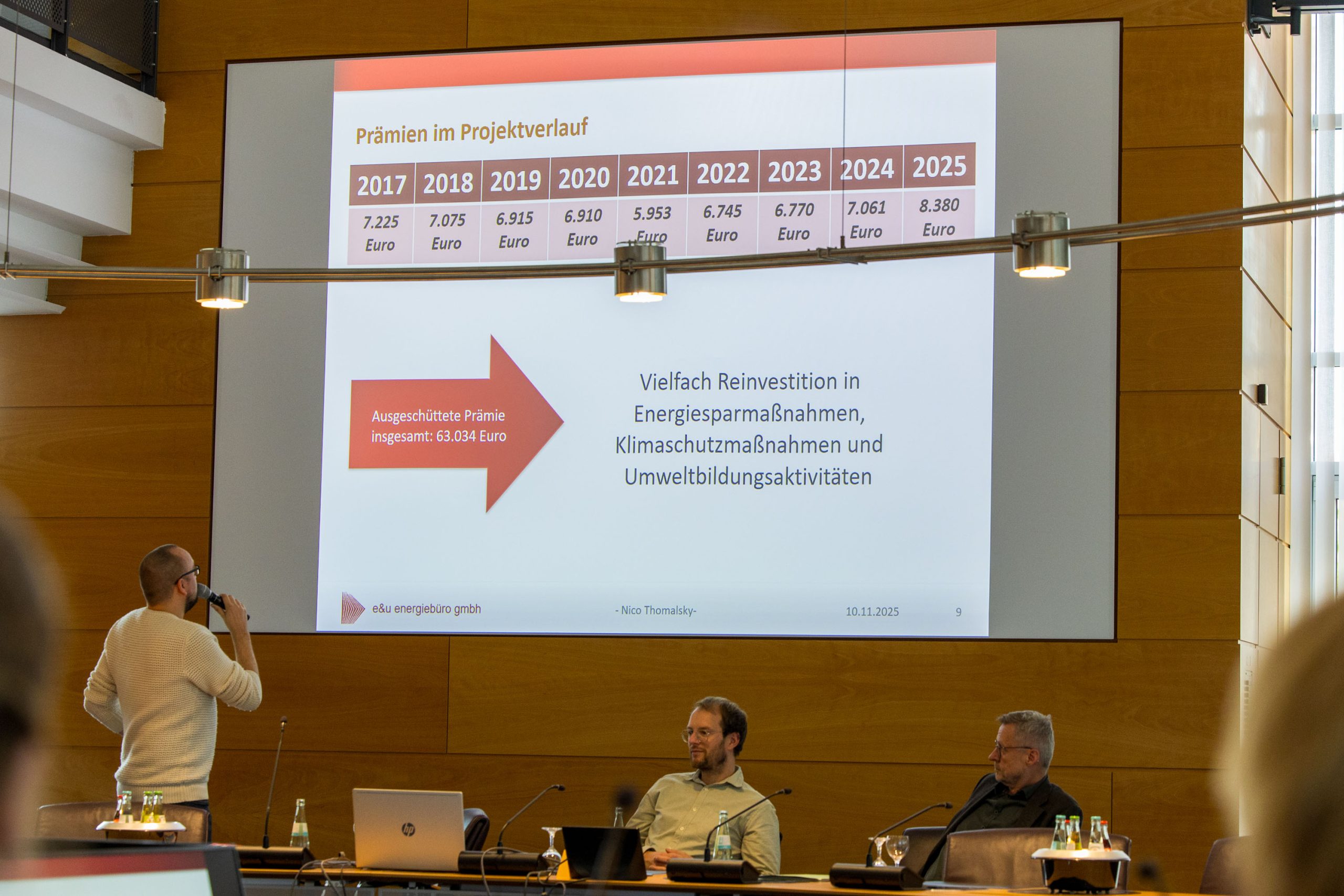 Zuvor hatte Nico Thomalsky vom e&u energiebüro aus Bielefeld, der das Projekt pädagogisch begleitet, eine Bilanz seit Beginn des Projektes im Jahr 2016 gezogen. In dieser Zeit wurden insgesamt 1,2 Millionen kWh an Wärme und 120.333 kWh an Strom eingespart. Eine beachtliche Zahl, die umgerechnet zu einer Einsparung von circa 400 Tonnen CO2 führt. „Verbildlicht bedeutet diese Menge ungefähr den Ausstoß an CO2, der entsteht, wenn man 33 Mal mit dem Auto um die Erde fährt. Oder man könnte dafür 3,8 Millionen Tassen Kaffee trinken“, machte Thomalsky den Erfolg nochmal sichtbarer.