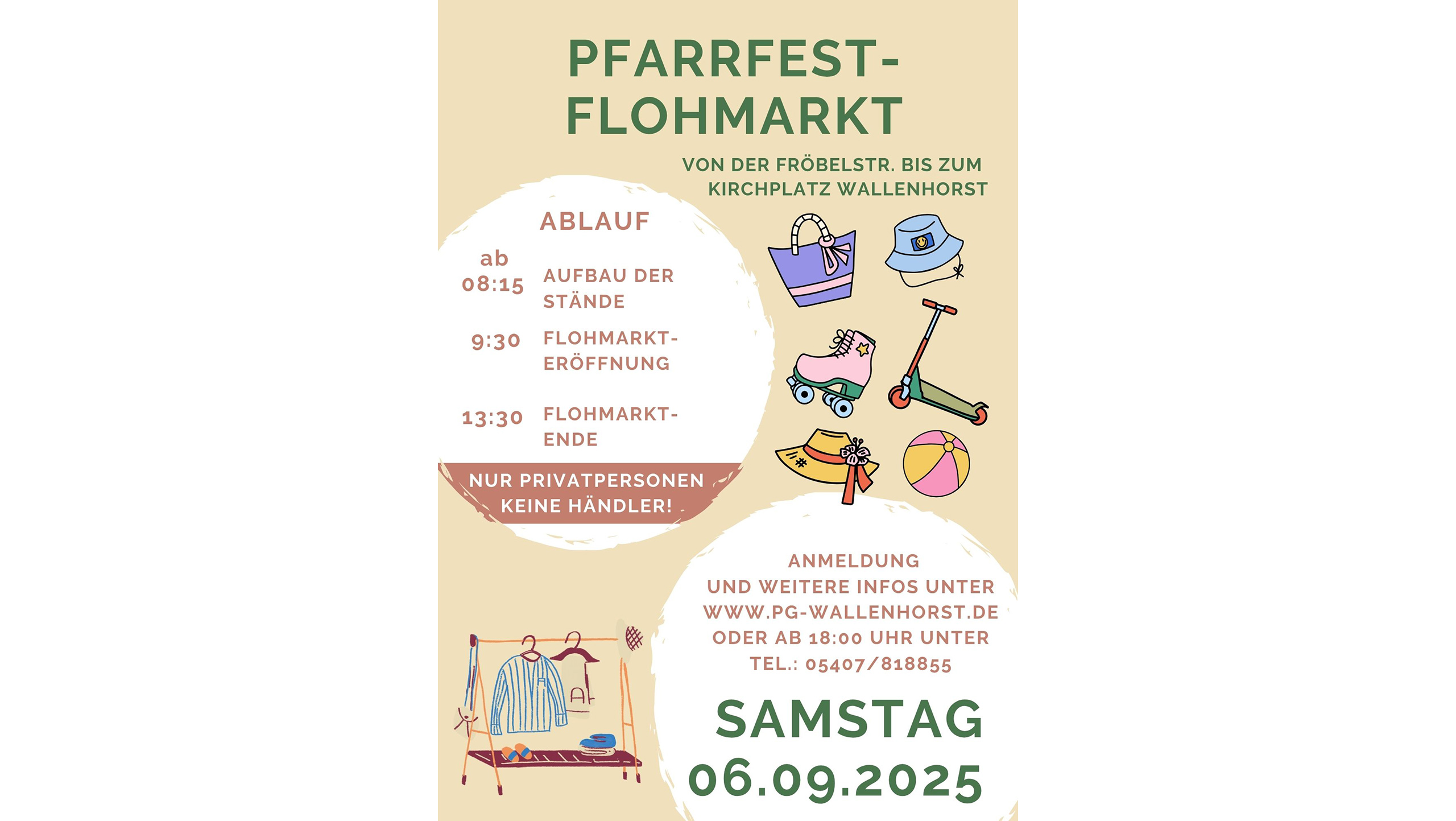 Anmeldung unter Angabe Ihres Namens und Ihrer Telefonnummer bitte unter: flohmarkt-wallenhorst@web.de oder ab 18.00 Uhr telefonisch unter 05407 818855