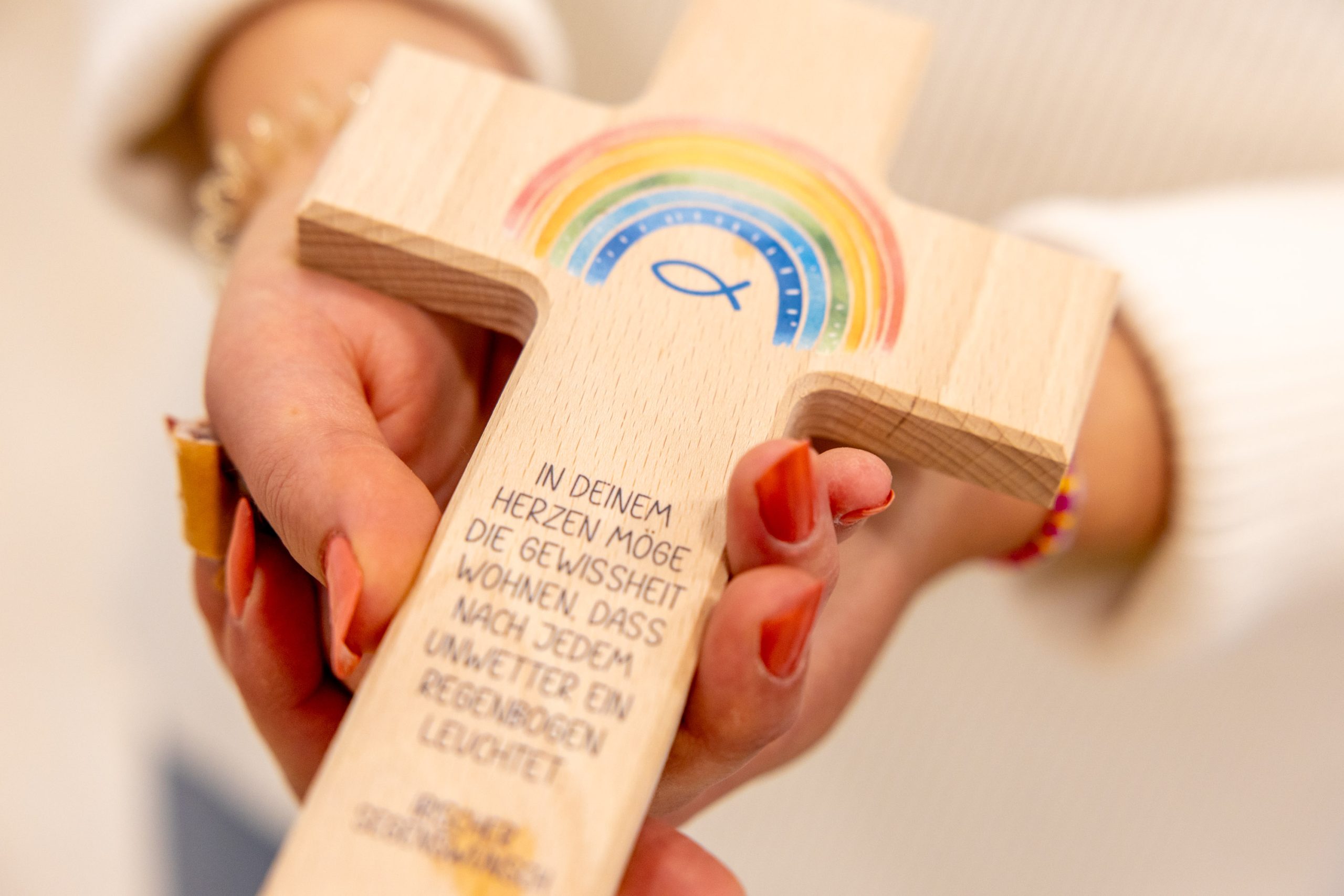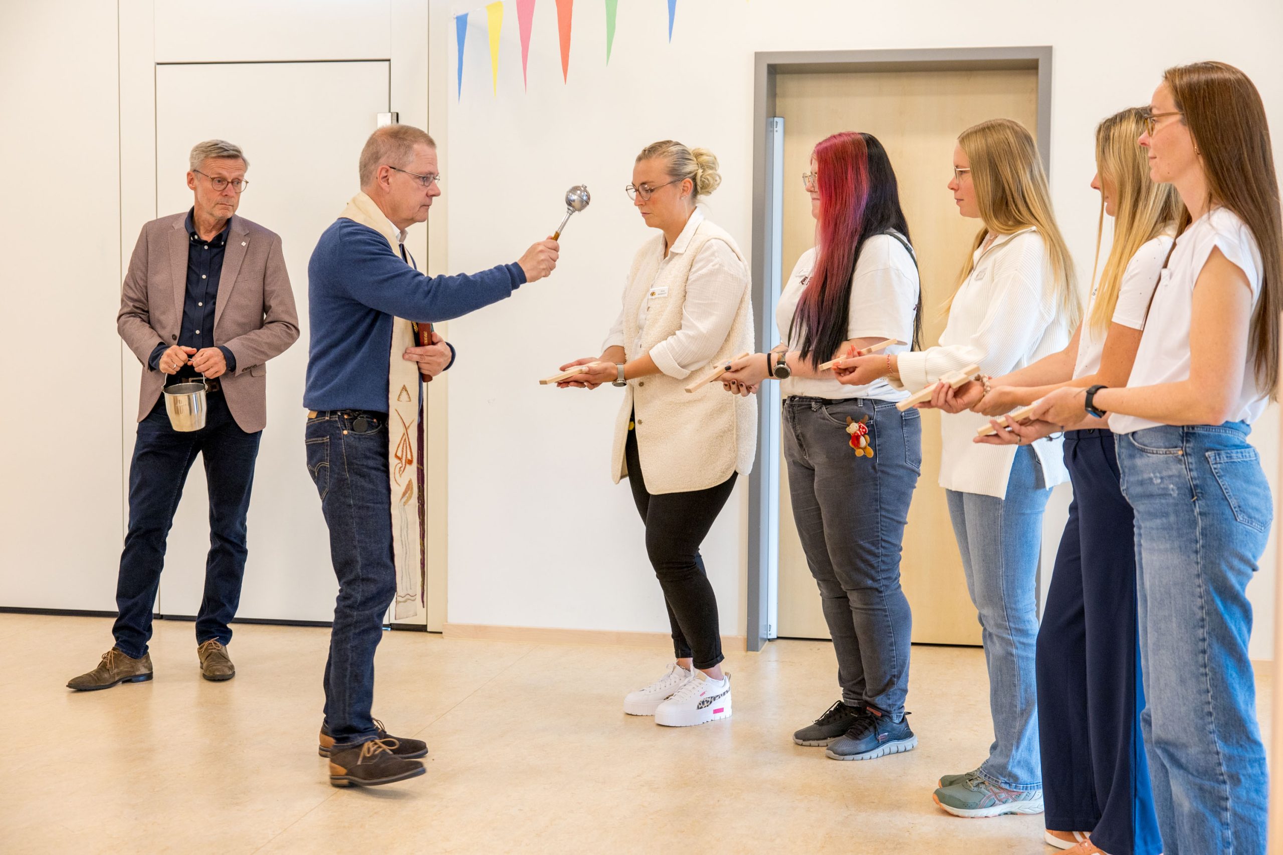 Pfarrer Bernhard Horstmann erklärte seitens der Katholischen Kirche als Träger der Einrichtung und mit Blick auf die großzügig gestalteten Räumlichkeiten, dass die Mitarbeitenden hier durchaus einen „gesunden Arbeitsplatz“ hätten. „Wenn Sie täglich Ihre Schritte zählen, sind Sie hier immer auf der Poleposition.“ Horstmann segnete fünf Kreuze, die in den Gruppenräumen ihren Platz finden werden – unterstützt von Bürgermeister Otto Steinkamp als Messdiener.