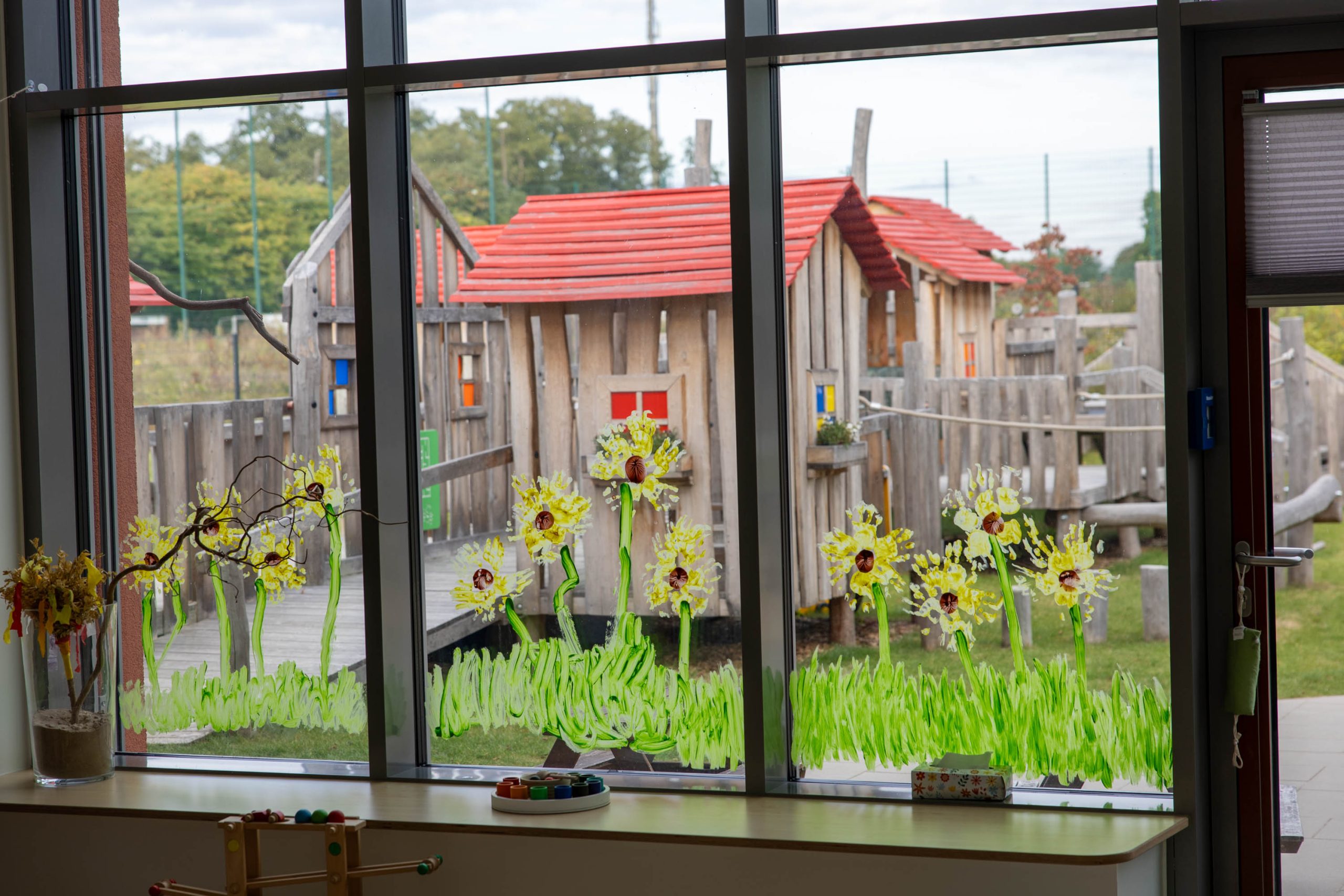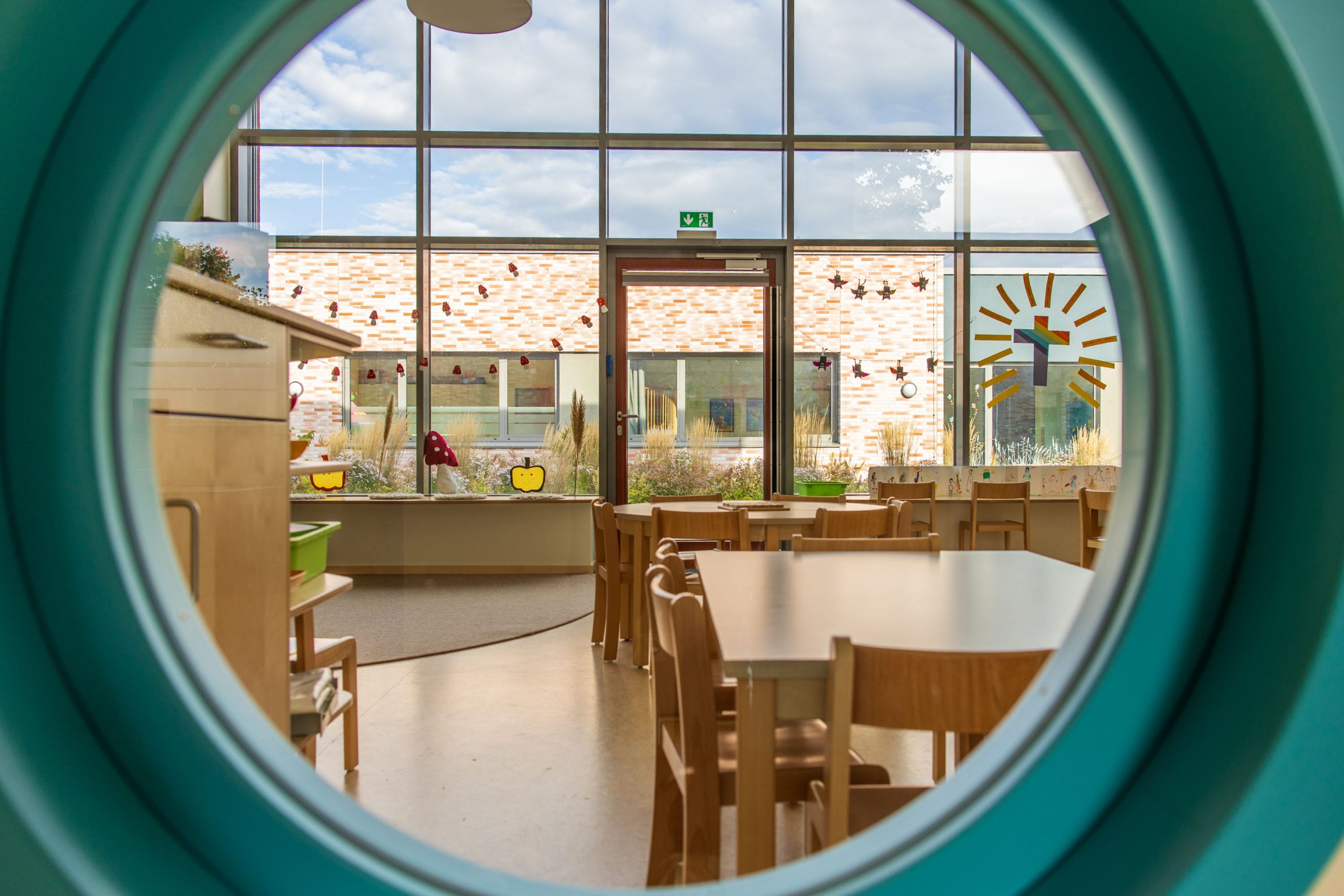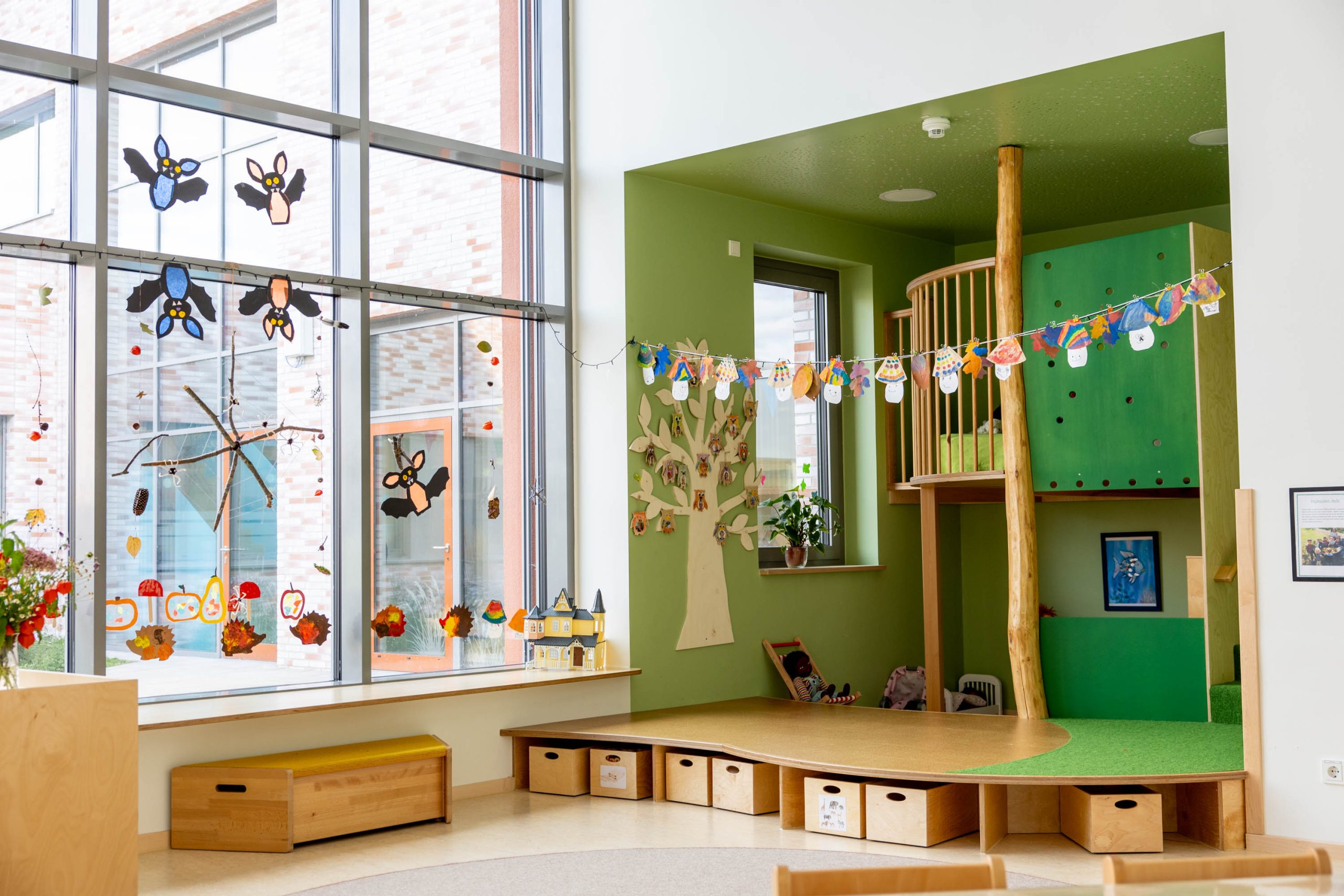 In einem mit hellroten Klinkern versehenen Energie-Effizienz-Gebäude bietet sie Platz für 98 Kinder, unterteilt in zwei Krippengruppen für Kinder unter drei Jahre sowie zwei Regelgruppen und eine Integrativgruppe für Kinder von drei bis sechs Jahre.