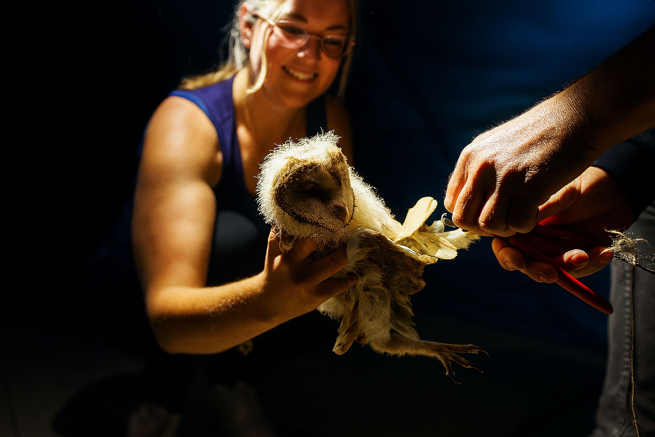 Eine weitere Vogelart, die gerne an Gebäuden brütet ist die Schleiereule. Vor gut 15 Jahren wurde im First der Hofstelle Duling ein Nistkasten für die hellen Eulen angebracht. Nachdem er einige Jahre von Dohlen besetzt war, sind in diesem Jahr drei Junge Schleiereulen darin groß geworden. „Bis zu ihrem Ausflug wird es nicht mehr lange dauern, sie haben bald schon ihr vollständiges Großgefieder.“ berichtet Isabella Markfort. Auch sie wurden mit Ringen der Vogelwarte Helgoland versehen.