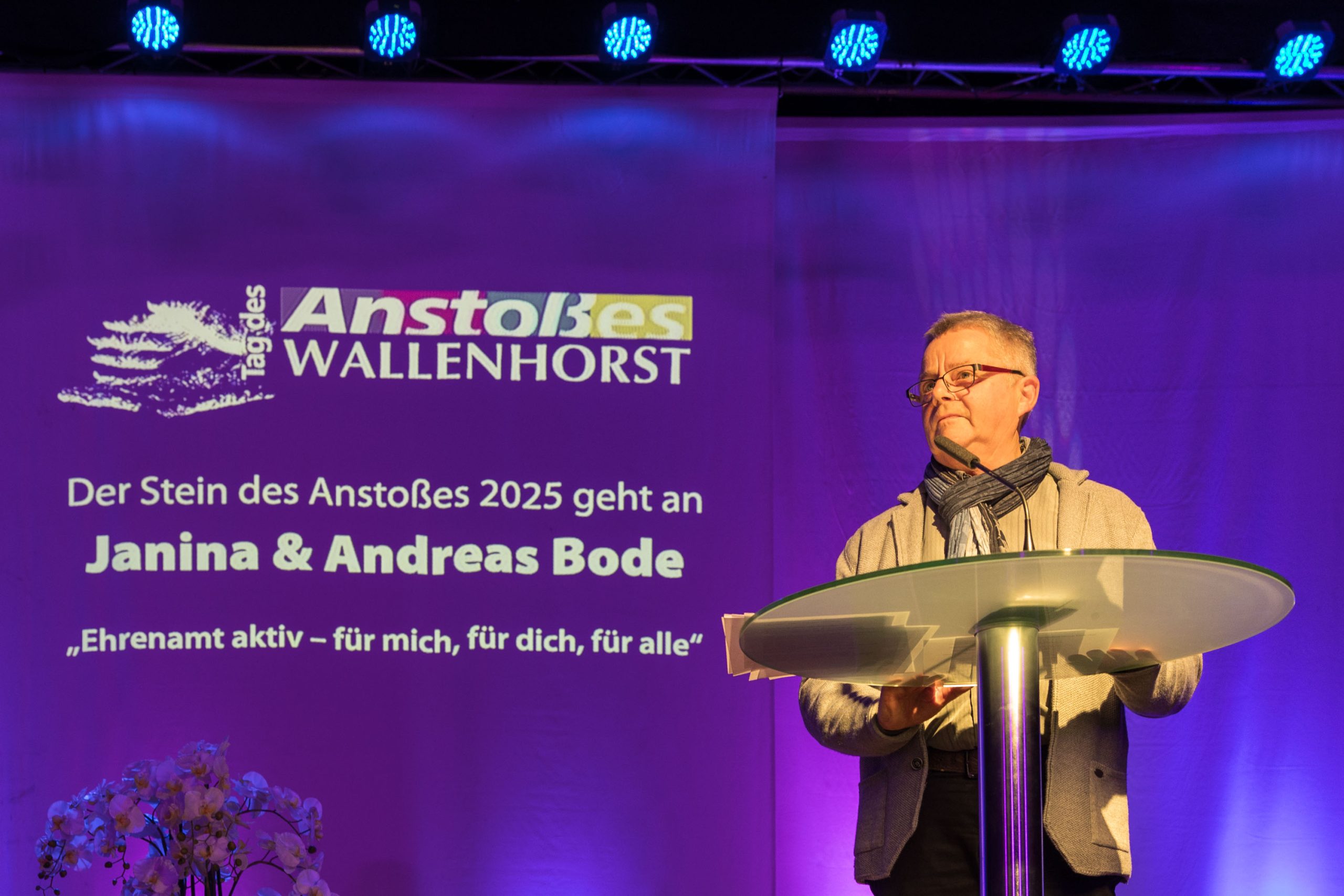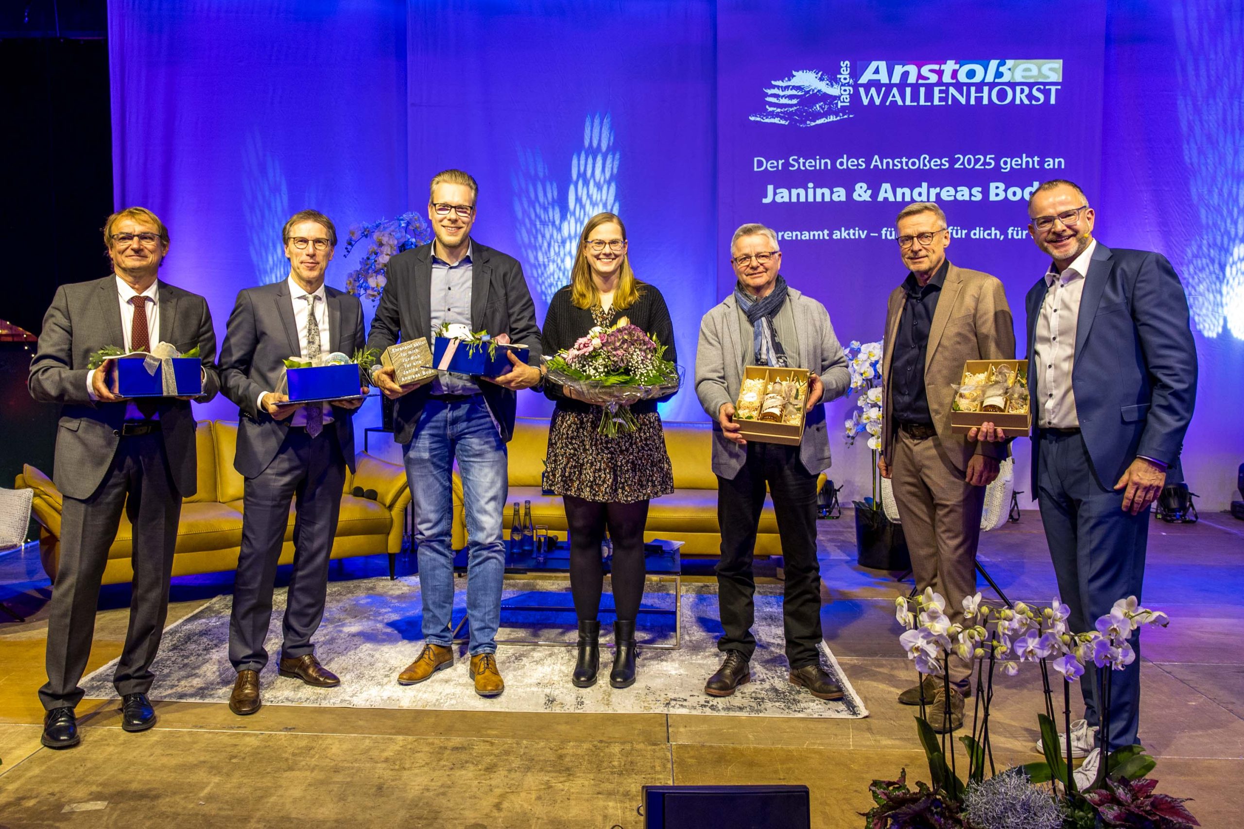 Begleitet vom Applaus der rund 650 Gäste in der Sporthalle an der Fröbelstraße überreichte Bürgermeister Otto Steinkamp am Freitag, 7. November, den „Stein des Anstoßes 2025“ – den Ehrenamtspreis der Gemeinde Wallenhorst – an Janina und Andreas Bode. Passend zum Jahresthema „Ehrenamt aktiv – für mich, für dich, für alle!“ würdigte die Jury damit ein vielseitig engagiertes Paar, das sich in besonderem Maße ehrenamtlich aktiv in die Gesellschaft einbringt.
