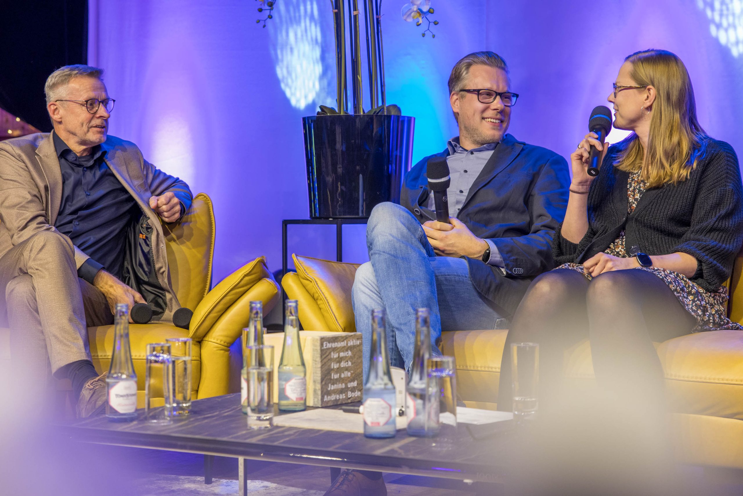 Reden schwingen mussten sie dann auch nicht – ein paar Fragen hatte Christian Böwer, der den Abend in Vertretung für Ludger Abeln nach zehnjähriger Pause wieder souverän moderierte, aber dennoch an die frisch gekürten Preisträger. So erklärten sie in lockerer Gesprächsrunde, dass sie zwar viel im Hintergrund arbeiten, aber in den Rollen der Trainerin und des Vize-Präsidenten auch mal in der ersten Reihe stehen würden. „Die Mischung macht‘s“. Geprägt in Sachen Ehrenamt seien sie schon durch ihre Eltern, die sie jetzt in deren Ruhestand wieder zurück ins aktive Engagement holt hätten, verriet Janina Bode. „Wir hatten im Kolping-Vorstand eine Vakanz. Da habe ich meine Mutter mal des Öfteren gefragt, ob das nicht etwas für sie wäre …“. Und ihr Vater fahre jetzt den Bürgerbus. Sie hoffe, dass es auch auf ihre Kinder abstrahle. Diese seien zurzeit zumindest gut gelaunt immer mit dabei, ob beim Sport oder beim Müllsammeln nach dem Oktoberfest. Um alles zu organisieren brauche man jedenfalls einen gut strukturierten Kalender, erläuterte Andreas Bode, „am besten digital, damit er immer zur Hand ist.“ Am Wochenende seien viele Veranstaltungen und unter der Woche hätten sie jeweils zwei Tage für ihre jeweiligen Ehrenämter. „Und wenn mittwochs keine Kolping-Vorstandssitzung ist, haben wir auch mal einen Abend für uns.“