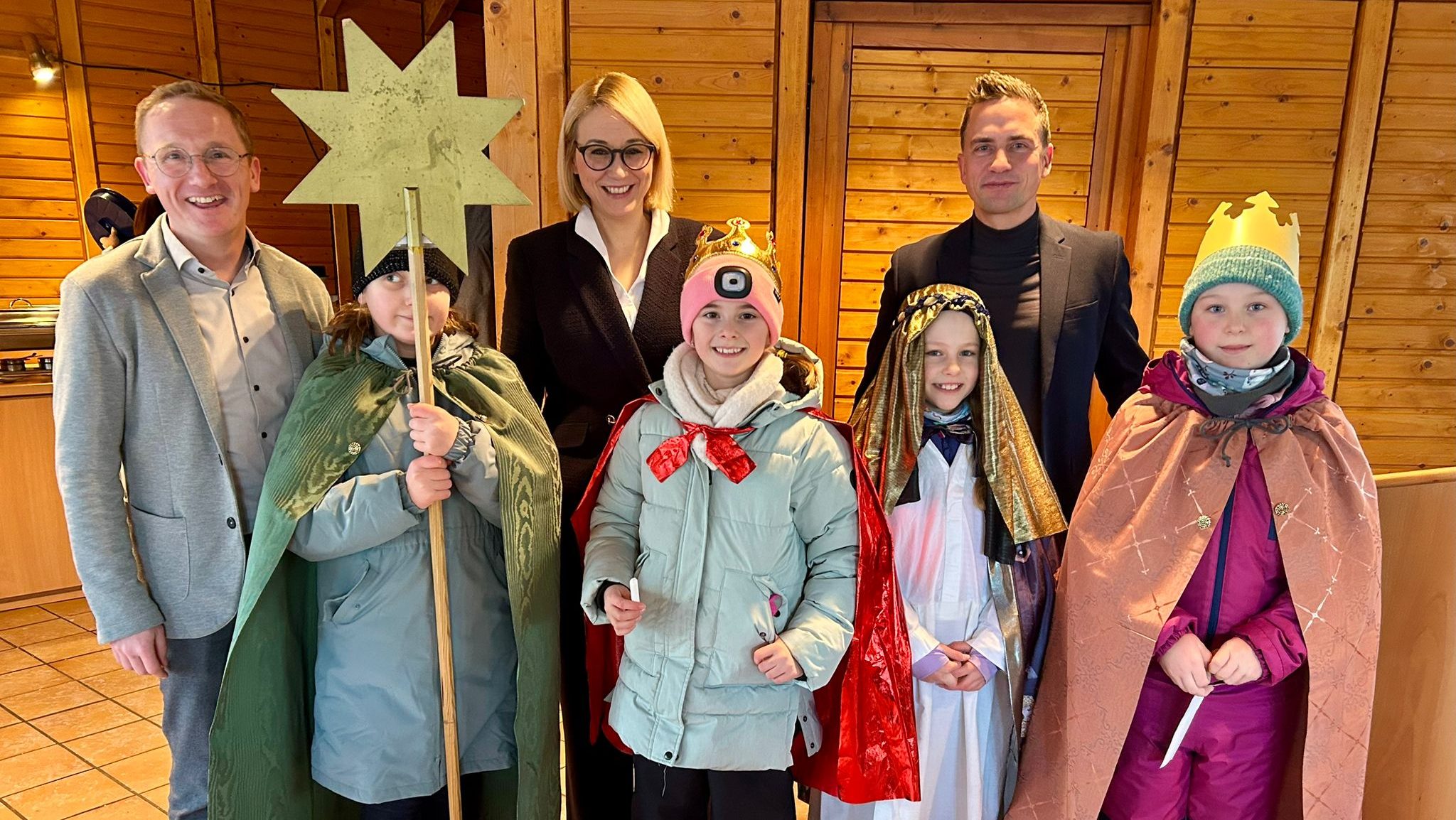 Michael Lührmann (Bürgermeisterkandidat CDU/CDW, Oberbürgermeisterin Katharina Pötter und Fraktionsvorsitzender Christian Schiffbänker mit dem spontanen Besuch der hl. Drei Könige. Foto: Matthias Owerrin