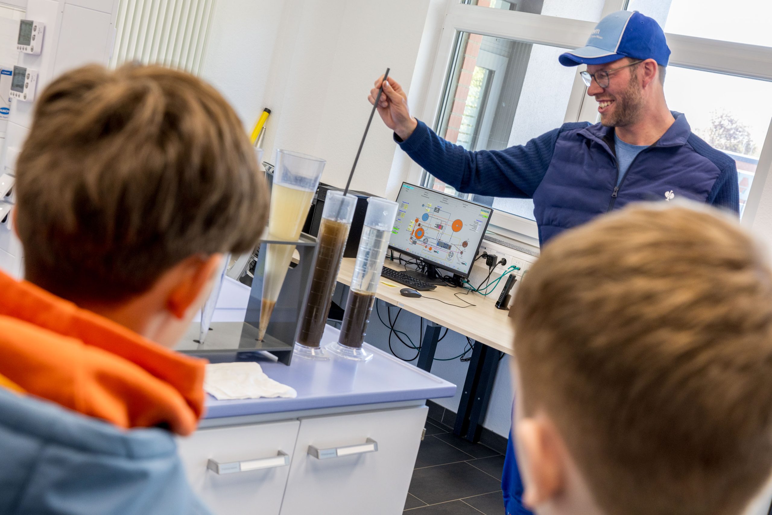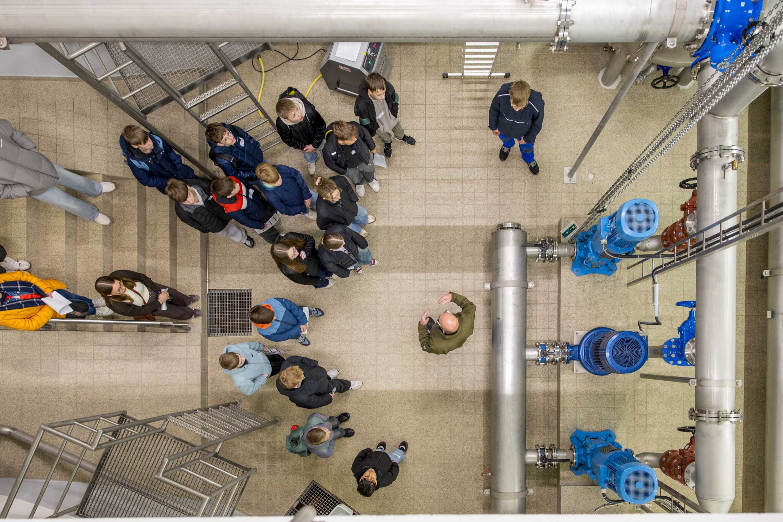 Bürgermeister Otto Steinkamp begrüßte sie dabei persönlich im Ratssaal und erklärte bezogen auf seinen eigenen Job, dass ein Bürgermeister nicht alles selbst wisse müsse, sondern auf ein starkes Team in der Verwaltung und den Außenstellen angewiesen sei. „Spannend daran ist, dass man Einblicke in alle Bereiche bekommt. Ich glaube, ihr werdet überrascht sein, wie vielfältig die Aufgaben der Gemeinde sind.“ Diese Vielfalt konnten die Schülerinnen und Schüler im Laufe des Tages selbst entdecken. In einem Quiz bekamen sie einen Einblick in die Verwaltung und lernten auf einer anschließenden Besichtigungstour das Wasserwerk, das Klärwerk, die Feuerwehr und den Baubetriebshof kennen. Die Strecke vom Feuerwehrhaus zum benachbarten Bauhof durften sie dabei in einem Feuerwehrfahrzeug zurücklegen.